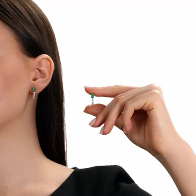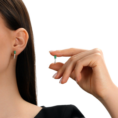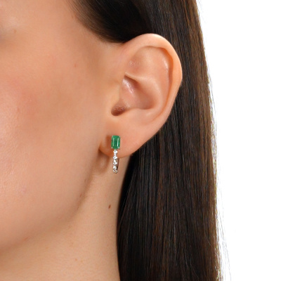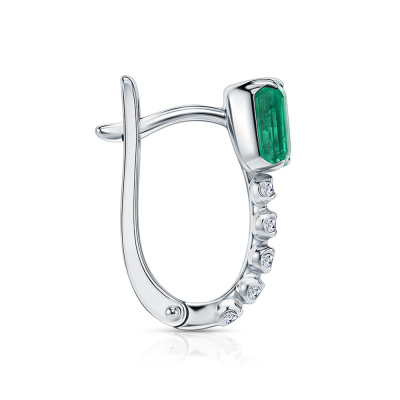 Серьги с 10 бриллиантами природными, 0.13 карат, огранка круг 57 граней, цвет 3, чистота 6, тип огранки А; 2 изумрудами природными, 0.98 карат, цвет 3, чистота 3, тип огранки Б; Белое золото 585 пробы.