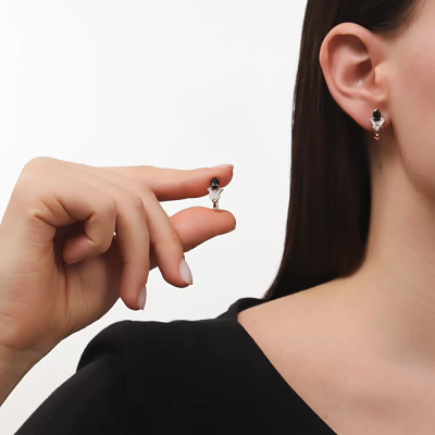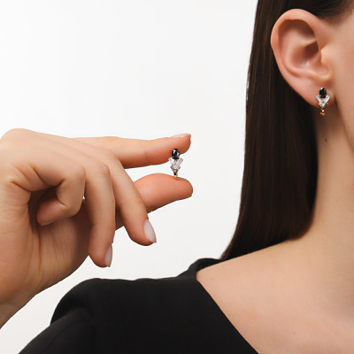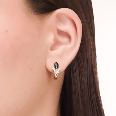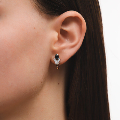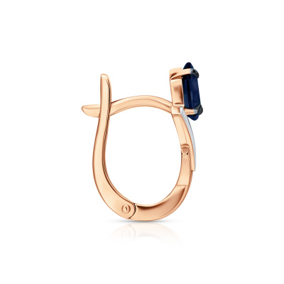 Серьги с 2 бриллиантами природными, 0.01 карат, огранка круг 57 граней, цвет 3, чистота 6, тип огранки А; 22 бриллиантами природными, 0.04 карат, огранка круг 17 граней, цвет 2, чистота 2, тип огранки А; 2 сапфирами природными, 1.06 карат, цвет 2, чистота 2, тип огранки Б; Розовое золото 585 пробы.