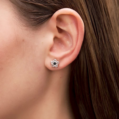 Серьги с 10 топазами бесцветными природными, 1.39 карат; 2 сапфирами природными, 0.08 карат, цвет 2, чистота 2, тип огранки В; Белое золото 585 пробы.