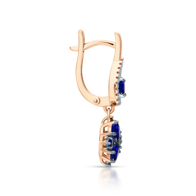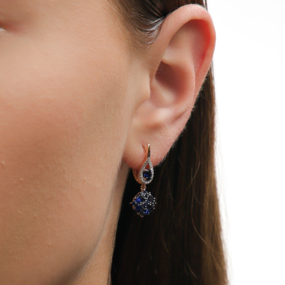 Серьги с 40 бриллиантами природными, 0.08 карат, огранка круг 17 граней, цвет 2, чистота 2, тип огранки А; 10 сапфирами синтетическими, 1.92 карат; 2 сапфирами синтетическими, 0.09 карат; 8 сапфирами синтетическими, 0.15 карат; Розовое золото 585 пробы.