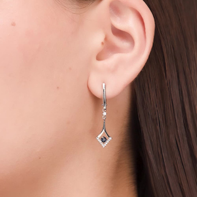 Серьги с 2 бриллиантами природными, 0.05 карат, огранка круг 57 граней, цвет 3, чистота 6, тип огранки А; 22 бриллиантами природными, 0.08 карат, огранка круг 17 граней, цвет 2, чистота 2, тип огранки А; 2 сапфирами природными, 0.26 карат, цвет 2, чистота 2, тип огранки В; Белое золото 585 пробы.