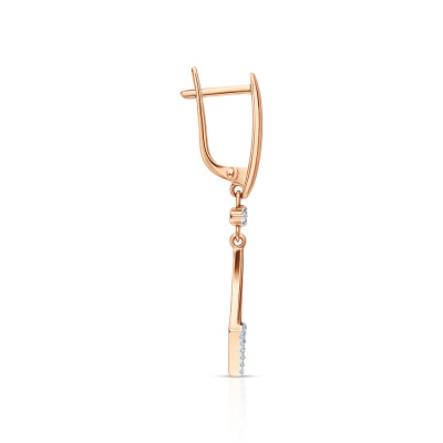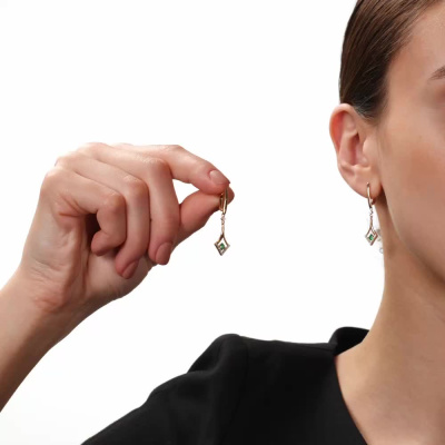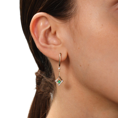 Серьги с 2 бриллиантами природными, 0.05 карат, огранка круг 57 граней, цвет 3, чистота 6, тип огранки А; 22 бриллиантами природными, 0.08 карат, огранка круг 17 граней, цвет 2, чистота 2, тип огранки А; 2 изумрудами природными, 0.18 карат, цвет 3, чистота 3, тип огранки В; Розовое золото 585 пробы.