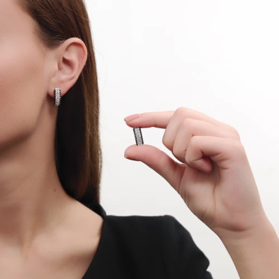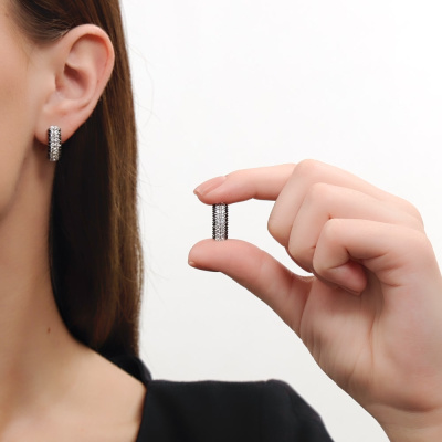 Серьги с 36 бриллиантами природными, 0.79 карат, огранка круг 57 граней, цвет 3, чистота 6, тип огранки А; 32 бриллиантами черными природными облагороженными, 0.51 карат, огранка круг 57 граней, цвет 7, чистота 6, тип огранки А; Белое золото 585 пробы.