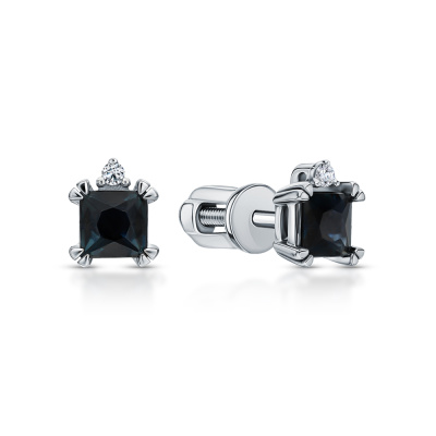 Серьги с 2 бриллиантами природными, 0.01 карат, огранка круг 17 граней, цвет 2, чистота 2, тип огранки А; 2 сапфирами природными, 0.58 карат, цвет 2, чистота 2, тип огранки В; Белое золото 585 пробы.