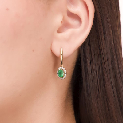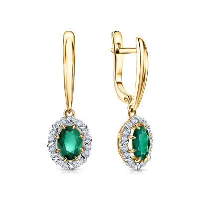 Серьги с 32 бриллиантами природными, 0.18 карат, огранка круг 17 граней, цвет 2, чистота 2, тип огранки А; 2 изумрудами природными, 1.4 карат, цвет 3, чистота 3, тип огранки Б; Желтое золото 585 пробы.