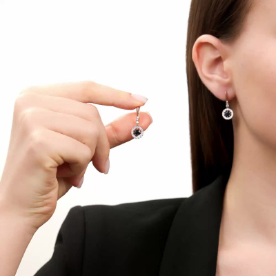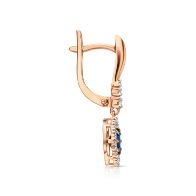 Серьги с 2 бриллиантами природными, 0.06 карат, огранка круг 57 граней, цвет 3, чистота 6, тип огранки А; 30 бриллиантами природными, 0.37 карат, огранка круг 57 граней, цвет 3, чистота 6, тип огранки А; 2 бриллиантами природными, 0.01 карат, огранка круг 57 граней, цвет 3, чистота 6, тип огранки А; 2 сапфирами природными, 1.08 карат, цвет 2, чистота 2, тип огранки В; Розовое золото 585 пробы.