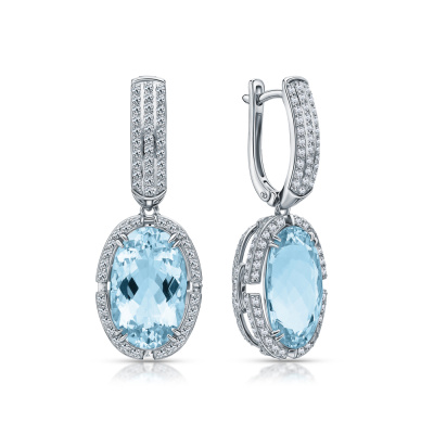 Серьги с 274 бриллиантами природными, 1.94 карат, огранка круг 57 граней, цвет 3, чистота 6, тип огранки А; 2 аквамаринами природными, 15.31 карат; Белое золото 585 пробы.