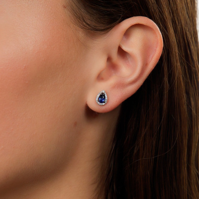 Серьги с 44 бриллиантами природными, 0.09 карат, огранка круг 17 граней, цвет 2, чистота 2, тип огранки А; 2 сапфирами выращенными, 0.97 карат; Белое золото 585 пробы.