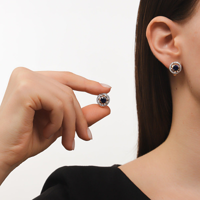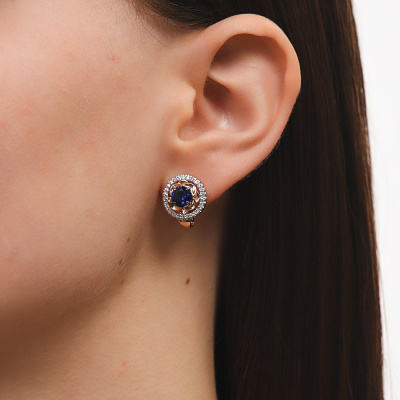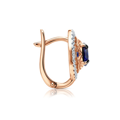 Серьги с 56 бриллиантами природными, 0.28 карат, огранка круг 17 граней, цвет 2, чистота 2, тип огранки А; 2 сапфирами синтетическими, 2.03 карат; Розовое золото 585 пробы.