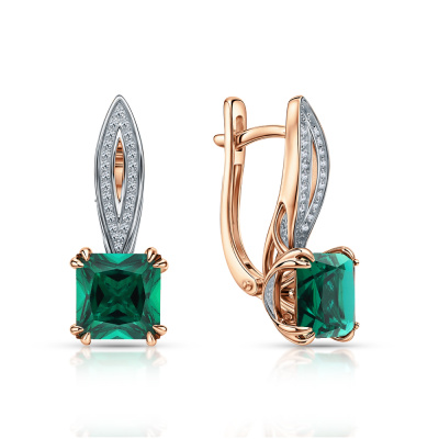 Серьги с 8 бриллиантами природными, 0.03 карат, огранка круг 17 граней, цвет 2, чистота 2, тип огранки А; 12 бриллиантами природными, 0.03 карат, огранка круг 17 граней, цвет 2, чистота 2, тип огранки А; 56 бриллиантами природными, 0.1 карат, огранка круг 17 граней, цвет 2, чистота 2, тип огранки А; 2 гидротермальными изумрудами, 3.17 карат; Розовое золото 585 пробы.