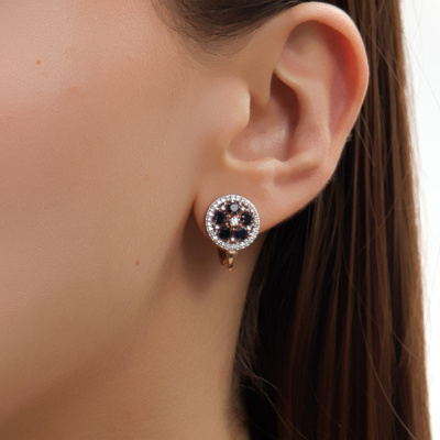 Серьги с 2 бриллиантами природными, 0.05 карат, огранка круг 57 граней, цвет 3, чистота 6, тип огранки А; 70 бриллиантами природными, 0.34 карат, огранка круг 17 граней, цвет 2, чистота 2, тип огранки А; 10 сапфирами синтетическими, 1.45 карат; Розовое золото 585 пробы.