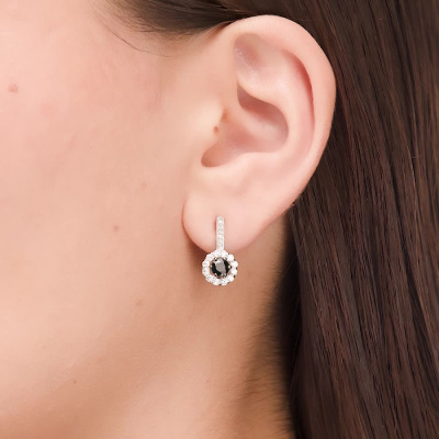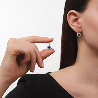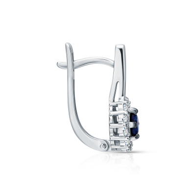 Серьги с 24 бриллиантами природными, 0.48 карат, огранка круг 57 граней, цвет 3, чистота 6, тип огранки А; 12 бриллиантами природными, 0.06 карат, огранка круг 17 граней, цвет 2, чистота 2, тип огранки А; 2 сапфирами природными, 0.8 карат, цвет 2, чистота 2, тип огранки В; Белое золото 585 пробы.
