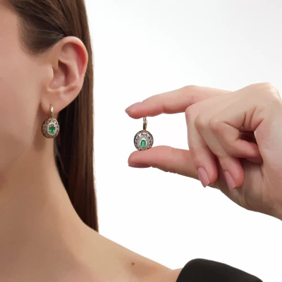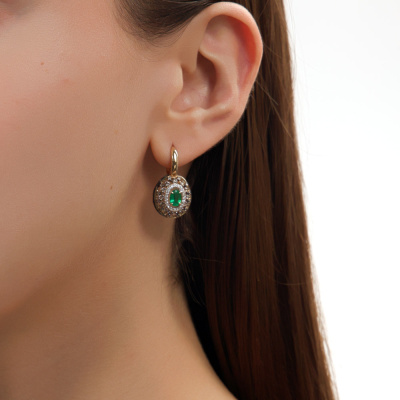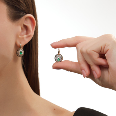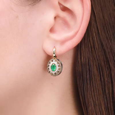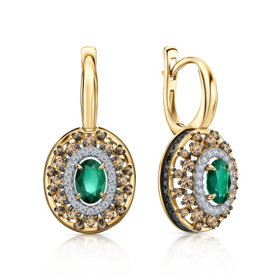 Серьги с 40 бриллиантами природными, 0.16 карат, огранка круг 17 граней, цвет 2, чистота 2, тип огранки А; 2 изумрудами природными, 0.69 карат, цвет 3, чистота 3, тип огранки Б; 24 бриллиантами коньячными природными, 0.53 карат, огранка круг 57 граней, цвет 7, чистота 5, тип огранки А; 24 бриллиантами коньячными природными, 0.19 карат, огранка круг 57 граней, цвет 7, чистота 5, тип огранки А; 66 бриллиантами черными природными облагороженными, 0.29 карат, огранка круг 57 граней, цвет 7, чистота 6, тип огранки А; Желтое золото 585 пробы.
