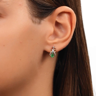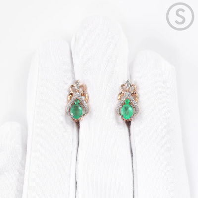 Серьги с 40 бриллиантами природными, 0.08 карат, огранка круг 17 граней, цвет 2, чистота 2, тип огранки А; 2 изумрудами природными, 0.58 карат, цвет 3, чистота 3, тип огранки Б; 2 изумрудами природными, 0.04 карат, цвет 3, чистота 3, тип огранки В; Розовое золото 585 пробы.