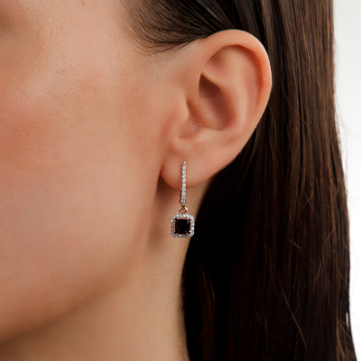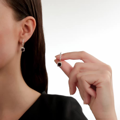 Серьги с 18 бриллиантами природными, 0.14 карат, огранка круг 57 граней, цвет 3, чистота 6; 66 бриллиантами природными, 0.32 карат, огранка круг 17 граней, цвет 2, чистота 2; 2 гранатами природными, 1.69 карат; Розовое золото 585 пробы.