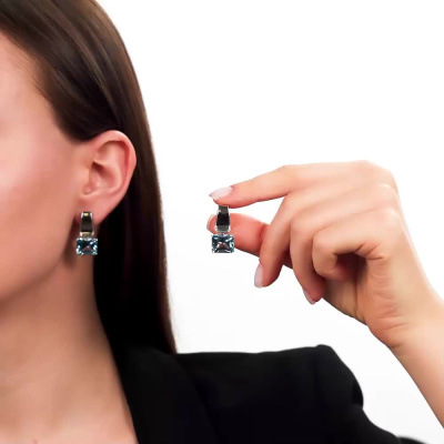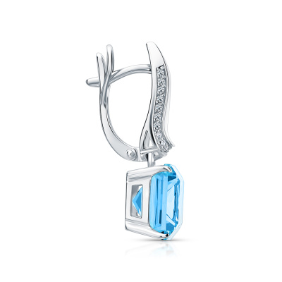 Серьги с 46 бриллиантами природными, 0.18 карат, огранка круг 17 граней, цвет 2, чистота 2, тип огранки А; 2 топазами скай природными, 14.78 карат; Белое золото 585 пробы.