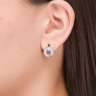 Серьги с 88 бриллиантами природными, 0.19 карат, огранка круг 17 граней, цвет 2, чистота 2, тип огранки А; 2 танзанитами природными, 0.49 карат, тип огранки В; Белое золото 585 пробы.