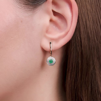 Серьги с 72 бриллиантами природными, 0.2 карат, огранка круг 17 граней, цвет 2, чистота 2, тип огранки А; 2 изумрудами природными, 0.44 карат, цвет 3, чистота 3, тип огранки В; Розовое золото 585 пробы.