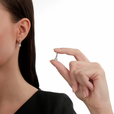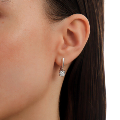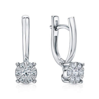 Серьги с 2 бриллиантами природными, 0.18 карат, огранка круг 57 граней, цвет 3, чистота 6, тип огранки А; 12 бриллиантами природными, 0.26 карат, огранка круг 57 граней, цвет 3, чистота 6, тип огранки А; Белое золото 585 пробы.
