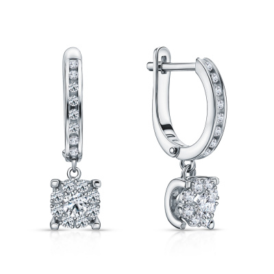 Серьги с 2 бриллиантами природными, 0.21 карат, огранка круг 57 граней, цвет 3, чистота 6, тип огранки А; 16 бриллиантами природными, 0.21 карат, огранка круг 57 граней, цвет 3, чистота 6, тип огранки А; 16 бриллиантами природными, 0.13 карат, огранка круг 57 граней, цвет 3, чистота 6, тип огранки А; Белое золото 585 пробы.