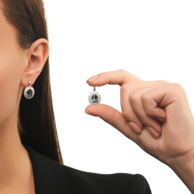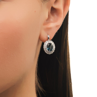 Серьги с 32 бриллиантами природными, 0.61 карат, огранка круг 57 граней, цвет 3, чистота 6, тип огранки А; 88 бриллиантами природными, 0.16 карат, огранка круг 17 граней, цвет 2, чистота 2, тип огранки А; 2 топазами лондон природными, 3.9 карат; Белое золото 585 пробы.