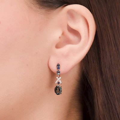 Серьги с 20 бриллиантами природными, 0.05 карат, огранка круг 17 граней, цвет 2, чистота 2, тип огранки А; 2 топазами лондон природными, 3.03 карат, тип огранки Б; 2 топазами лондон природными, 0.33 карат, тип огранки Б; 6 сапфирами природными, 0.16 карат, цвет 2, чистота 2, тип огранки В; Розовое золото 585 пробы.