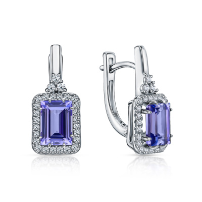 Серьги с 6 бриллиантами природными, 0.07 карат, огранка круг 57 граней, цвет 3, чистота 6, тип огранки А; 48 бриллиантами природными, 0.2 карат, огранка круг 17 граней, цвет 2, чистота 2, тип огранки А; 2 танзанитами природными, 2.62 карат; Белое золото 585 пробы.