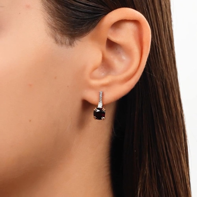 Серьги с 6 бриллиантами природными, 0.02 карат, огранка круг 17 граней, цвет 2, чистота 2, тип огранки А; 10 бриллиантами природными, 0.02 карат, огранка круг 17 граней, цвет 2, чистота 2, тип огранки А; 2 гранатами природными, 3.54 карат; Розовое золото 585 пробы.