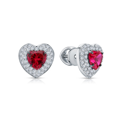 Серьги с 2 рубинами выращенными, 2.15 карат; 74 бриллиантами выращенными, 0.55 карат, огранка круг 57 граней, цвет 3, чистота 5, тип огранки А; Белое золото 585 пробы.