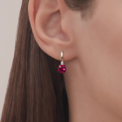 Серьги с 2 рубинами выращенными, 2.34 карат; 2 бриллиантами выращенными, 0.06 карат, огранка круг 57 граней, цвет 3, чистота 6, тип огранки А; Желтое золото 585 пробы.