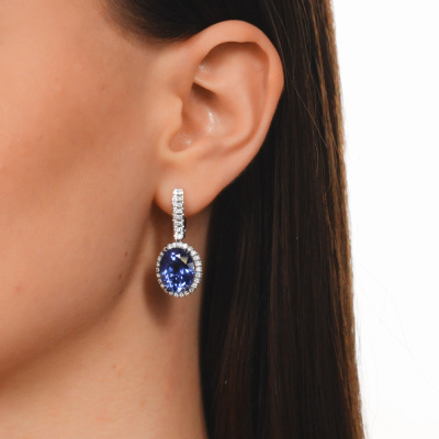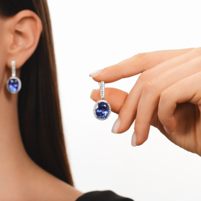 Серьги с 2 сапфирами выращенными, 18.44 карат; 132 бриллиантами выращенными, 0.91 карат, огранка круг 57 граней, цвет 3, чистота 5, тип огранки А; Белое золото 585 пробы.