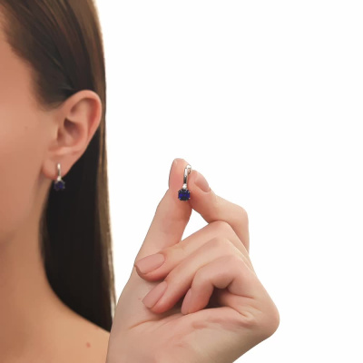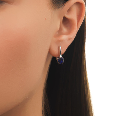 Серьги с 2 сапфирами выращенными, 2.65 карат; 2 бриллиантами выращенными, 0.06 карат, огранка круг 57 граней, цвет 3, чистота 6, тип огранки А; Белое золото 585 пробы.