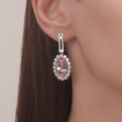 Серьги с 2 сапфирами выращенными, 18.46 карат; 32 бриллиантами выращенными, 3.75 карат, огранка круг 57 граней, цвет 3, чистота 6, тип огранки А; 40 бриллиантами выращенными, 0.27 карат, огранка круг 57 граней, цвет 3, чистота 5, тип огранки А; Белое золото 585 пробы.