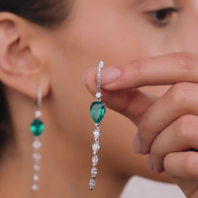 Серьги с 2 изумрудами выращенными Колумбия, 5.49 карат; 4 бриллиантами выращенными, 1.41 карат, огранка груша 56 граней, цвет 4, чистота 5, тип огранки А; 6 бриллиантами выращенными, 1.07 карат, огранка груша 56 граней, цвет 3, чистота 5, тип огранки А; 2 бриллиантами выращенными, 0.21 карат, огранка круг 57 граней, цвет 3, чистота 6, тип огранки А; 20 бриллиантами выращенными, 0.14 карат, огранка круг 57 граней, цвет 3, чистота 5, тип огранки А; Белое золото 585 пробы.