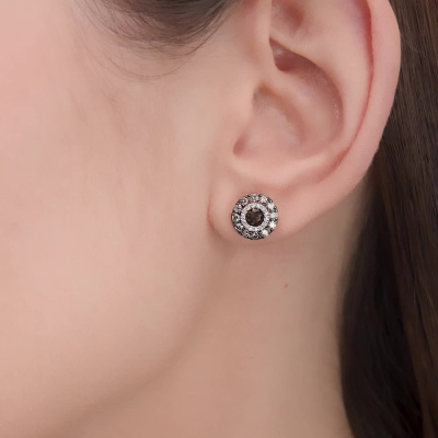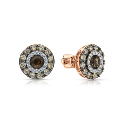 Серьги с 28 бриллиантами природными, 0.07 карат, огранка круг 17 граней, цвет 2, чистота 2, тип огранки А; 2 кварцами дымчатыми природными, 0.48 карат; 24 бриллиантами коньячными природными, 0.52 карат, огранка круг 57 граней, цвет 7, чистота 5, тип огранки А; Розовое и белое золото 585 пробы.