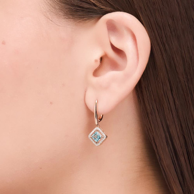 Серьги с 48 бриллиантами природными, 0.19 карат, огранка круг 17 граней, цвет 2, чистота 2, тип огранки А; 2 топазами свисс природными, 1.62 карат; Розовое золото 585 пробы.