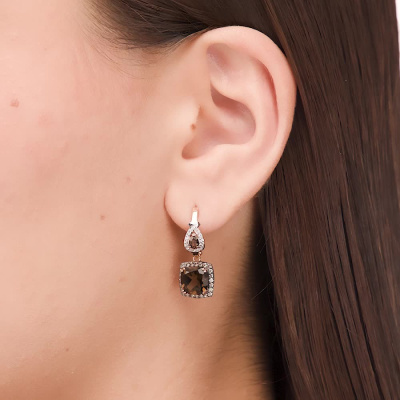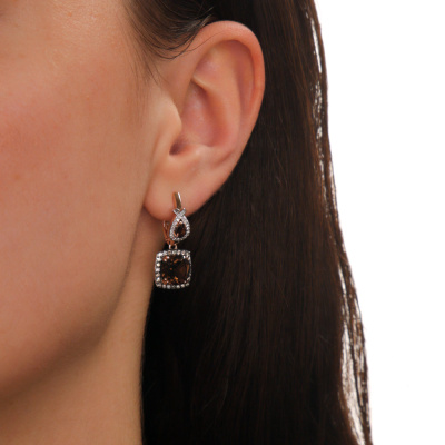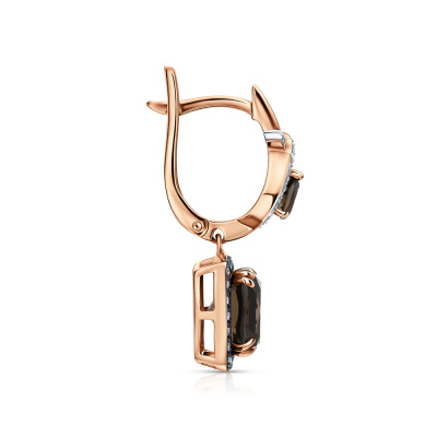 Серьги с 38 бриллиантами природными, 0.09 карат, огранка круг 17 граней, цвет 2, чистота 2, тип огранки А; 2 кварцами дымчатыми природными, 3.91 карат; 2 кварцами дымчатыми природными, 0.26 карат; 48 бриллиантами коньячными природными, 0.35 карат, огранка круг 57 граней, цвет 7, чистота 5, тип огранки А; Розовое золото 585 пробы.