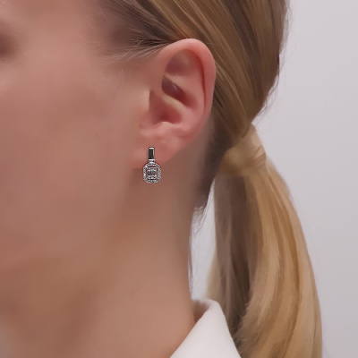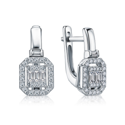Серьги с 8 бриллиантами природными, 0.28 карат, огранка багет 25 граней, цвет 3, чистота 5, тип огранки А; 48 бриллиантами природными, 0.16 карат, огранка круг 17 граней, цвет 2, чистота 3, тип огранки А; Белое золото 585 пробы.