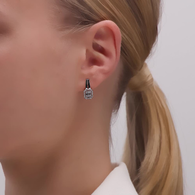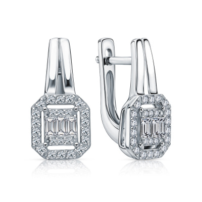Серьги с 6 бриллиантами природными, 0.22 карат, огранка багет 25 граней, цвет 3, чистота 5, тип огранки А; 48 бриллиантами природными, 0.16 карат, огранка круг 17 граней, цвет 2, чистота 3, тип огранки А; Белое золото 585 пробы.