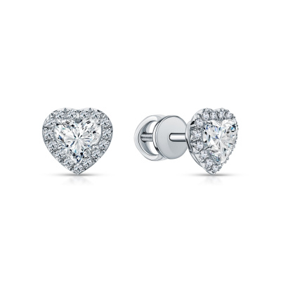 Серьги с 2 бриллиантами выращенными, 1.34 карат, огранка сердце 57 граней, цвет 4, чистота 5, тип огранки А; 30 бриллиантами выращенными, 0.22 карат, огранка круг 57 граней, цвет 3, чистота 5, тип огранки А; Белое золото 585 пробы.