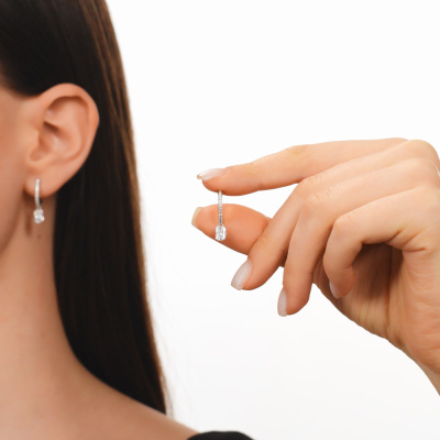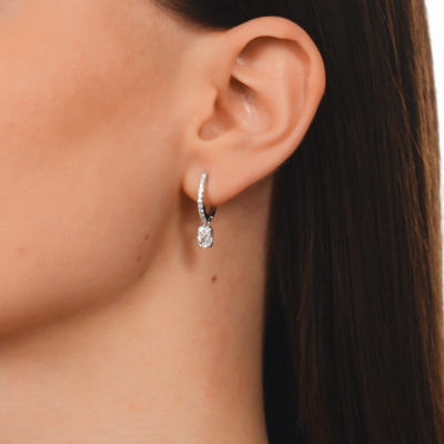 Серьги с 2 бриллиантами выращенными, 1.08 карат, огранка кушон 57 граней, цвет 3, чистота 5, тип огранки А; 20 бриллиантами выращенными, 0.15 карат, огранка круг 57 граней, цвет 2, чистота 5, тип огранки А; Белое золото 585 пробы.