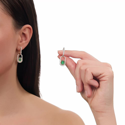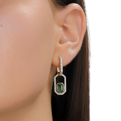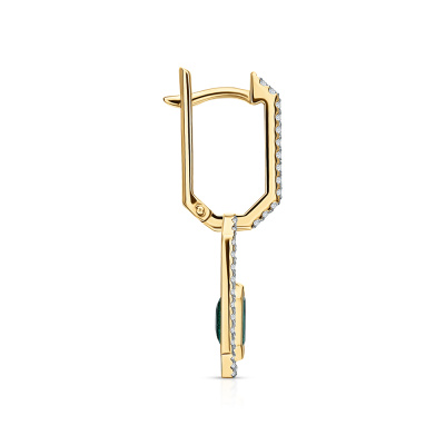 Серьги с 86 бриллиантами природными, 0.59 карат, огранка круг 57 граней, цвет 3, чистота 6, тип огранки А; 2 изумрудами природными, 1.84 карат, цвет 3, чистота 3, тип огранки Б; Желтое золото 585 пробы.