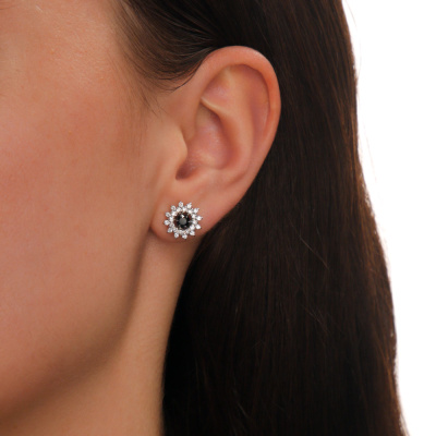 Серьги с 48 бриллиантами природными, 0.43 карат, огранка круг 57 граней, цвет 3, чистота 6, тип огранки А; 2 сапфирами природными, 0.46 карат, цвет 2, чистота 2, тип огранки В; Белое золото 585 пробы.