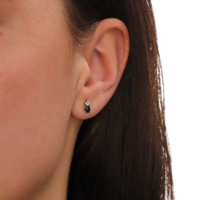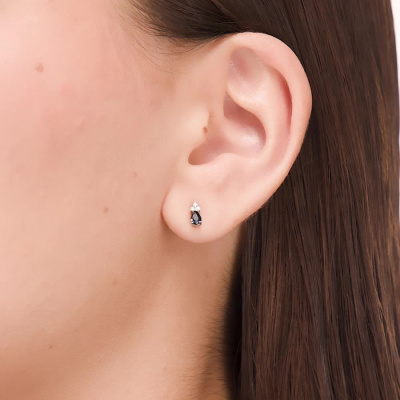 Серьги с 6 бриллиантами природными, 0.04 карат, огранка круг 17 граней, цвет 2, чистота 2, тип огранки А; 2 сапфирами природными, 0.33 карат, цвет 2, чистота 2, тип огранки Б; Белое золото 585 пробы.