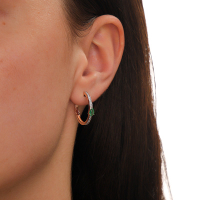 Серьги с 42 бриллиантами природными, 0.13 карат, огранка круг 17 граней, цвет 2, чистота 2, тип огранки А; 2 изумрудами природными, 0.33 карат, цвет 3, чистота 3, тип огранки Б; Розовое золото 585 пробы.