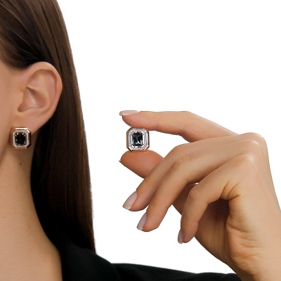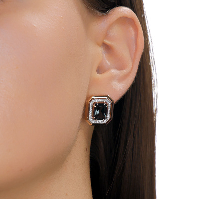 Серьги с 80 бриллиантами природными, 0.2 карат, огранка круг 17 граней, цвет 2, чистота 2, тип огранки А; 2 топазами лондон природными, 4.9 карат; Розовое золото 585 пробы.