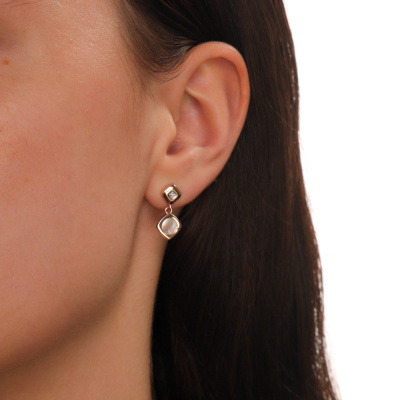 Серьги с 2 бриллиантами природными, 0.01 карат, огранка круг 17 граней, цвет 2, чистота 2, тип огранки А; 2 перламутрами белыми природными; Розовое золото 585 пробы.