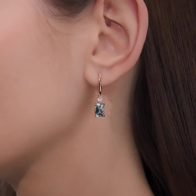 Серьги с 2 бриллиантами природными, 0.01 карат, огранка круг 17 граней, цвет 2, чистота 2, тип огранки А; 2 топазами скай природными, 3.69 карат; Розовое и белое золото 585 пробы.