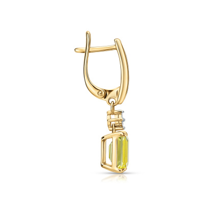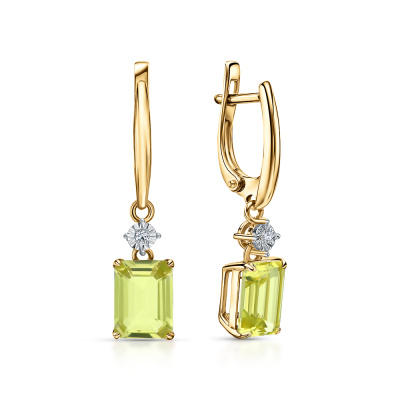 Серьги с 2 бриллиантами природными, 0.01 карат, огранка круг 17 граней, цвет 2, чистота 2, тип огранки А; 2 кварцами лимонными природными, 2.86 карат; Желтое и белое золото 585 пробы.