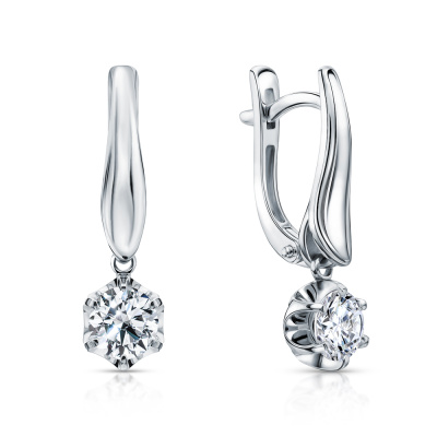 Серьги с 2 бриллиантами выращенными, 1.03 карат, огранка круг 57 граней, цвет 4, чистота 6, тип огранки А; Белое золото 585 пробы.